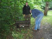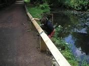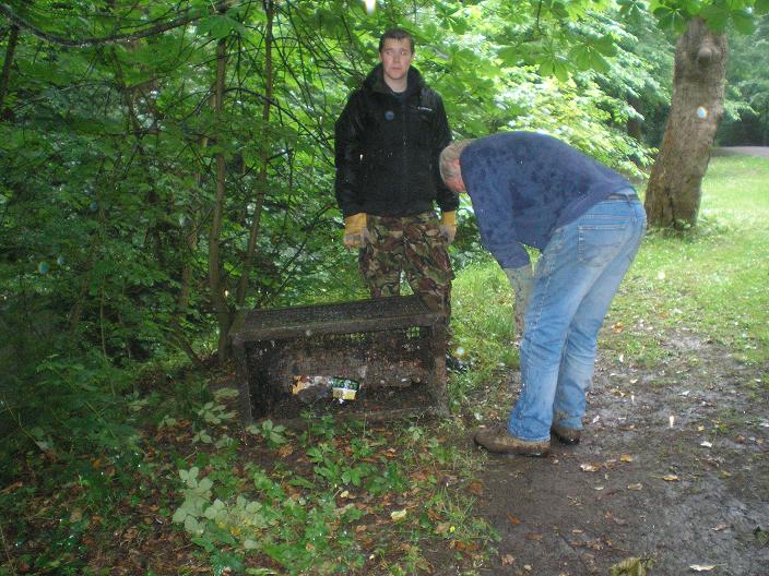 Friday 26th June 2009 It was very wet today but the volunteers enjoyed it anyway. We pushed back Japanese Knotweed from some fences and paths by the Old Mill so that the spread could be limited. Some of us laid wood chippings around the foot of a couple of oak trees, while the rest cleared mud, leaves and debris from some of the paths, and cut back encroaching greenery. On the way back we fished out a heavy litter bin which (for some unfathomable reason) had been hurled into the river.