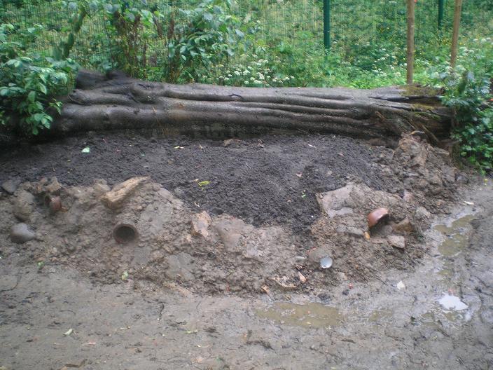 Friday 30th January 2009 More work today in the Nature Area: we managed to get out the big roots causing a problem near the small gate so have now adjusted the pond shape / size to take advantage of the extra room we have available. The pond boundary has been adjusted to allow a narrower 'trench' and we have put a bit more of a radius on at the corners to improve its shape. This is the area indicated by the red tape. The approximate position of the dipping platform (sized at about 4m x 3m) has been marked more clearly, again using red tape.