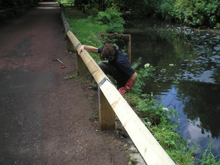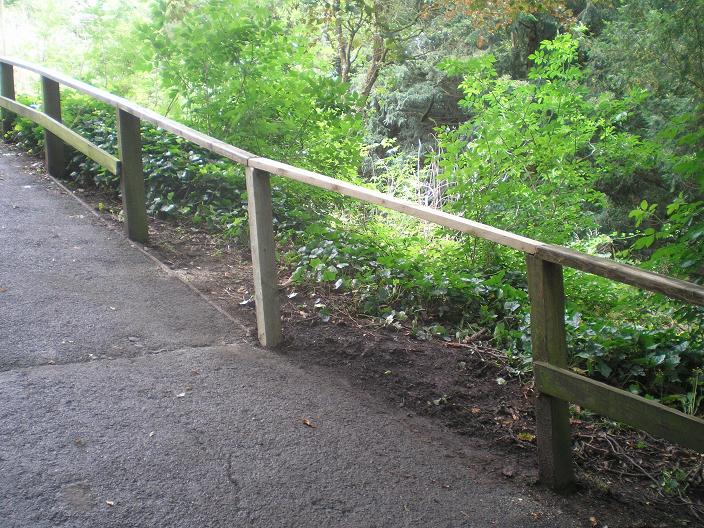 Sunday 12th July 2009 After a quick litter sweep around the garden to the rear of Millfield house and repair to the fence at the far end we moved on to repairs of the handrail on the very steep path leading up from Red Walk. One post was rotted through and had to be dug out (which was very hard work!) and replaced with a new post.
