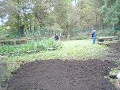 Sunday 26th October 2009 Lots of leaves falling now, so some sweeping of paths carried out. The rest of the day was spent in and around the Nature Area. The Ranger used a chain saw to cut through the trunks of felled trees so we could lift these up and remove them. More profiling and levelling of the pond was carried out and this is looking much improved, although there is still more work to be done here. The trickiest job was positioning the uprights to hold the dipping platform. This proved to be a frustrating job because we needed to get them into the correct position. When digging holes with the auger for positioning the other supports we kept hitting stones which made progress slow and arduous. Good progress made though which made us feel more cheerful!